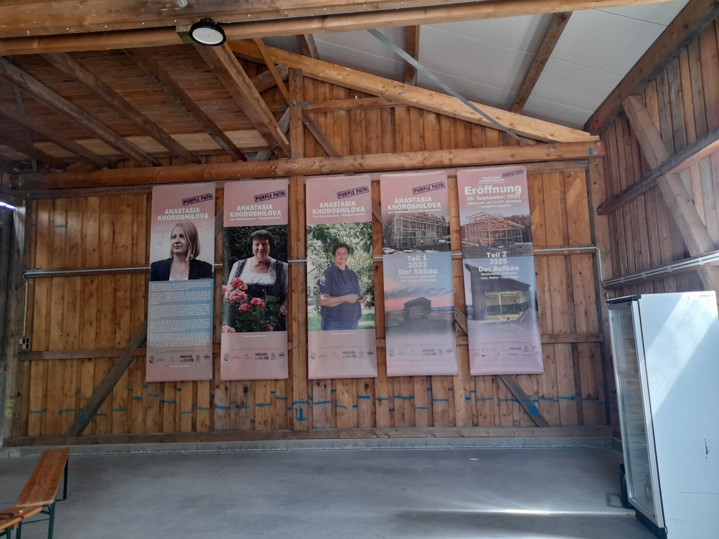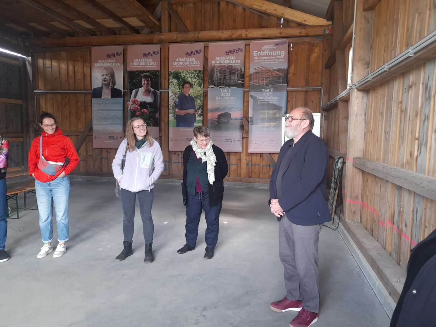 Weiter ging es in die LEADER-Region Tor zum Erzgebirge. Dort machten wir zunächst Halt am Hofmarkt der Familie Ziegs in Jahnsdorf. Die Neulandgewinner haben vor wenigen Jahren den Dorfverein „Jahnsdorf trifft sich“ gegründet und organisieren Mitmach-Werkstätten, Wanderungen, Baumpflanzungen oder frühstücken auch gern einmal mit dem ganzen Ort an einer langen Tafel. Mit dem LEADER-Projekt „ERZscheune – alle VereinT“, einem fotografischen Kunstprojekt zweier ehemaliger Milchviehbetriebe, wird Familie Ziegs Teil des „Purple Path“. Eine alte, ortsbildprägende Scheune, ein sogenannter „Stadl“ wurde dabei aus dem Allgäu abgetragen und in Jahnsdorf bei Familie Ziegs wieder aufgebaut. Ab- und Aufbau wurden dabei von der Künstlerin Anastasia Khoroshilova fotografisch begleitet und so zu einem Kunstprojekt. Der Kurator des Skulpturenpfades „Purple Path“, Alexander Ochs, erläuterte uns vor Ort die Idee und Entstehungsgeschichte des Projektes, welches sich aktuell noch in der Umsetzungsphase befindet. Später soll die Scheune den Menschen in Jahnsdorf als Begegnungs- und Veranstaltungsort zur Verfügung stehen.