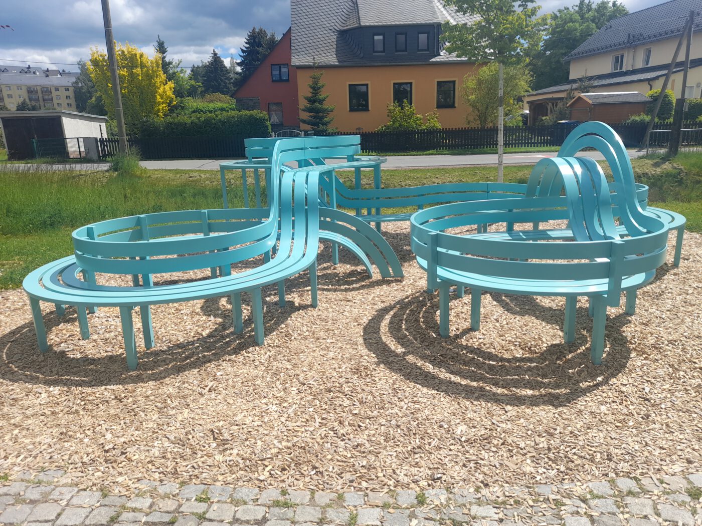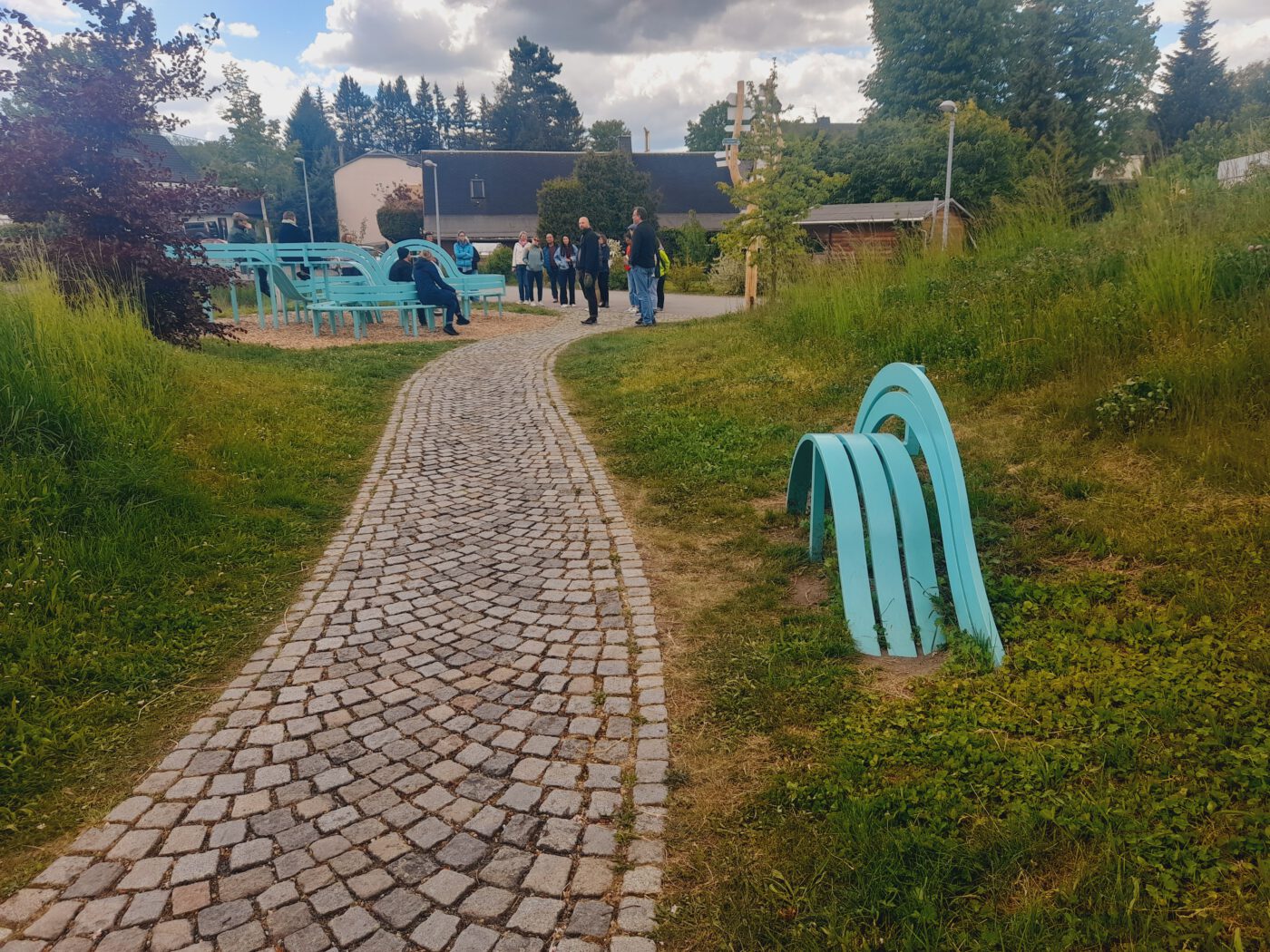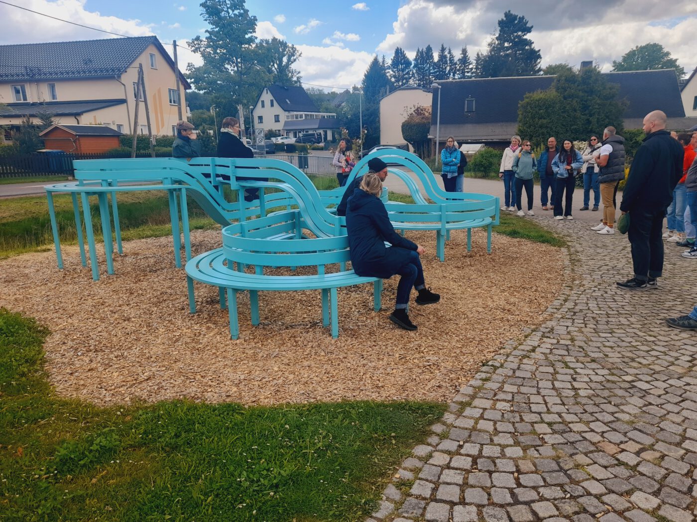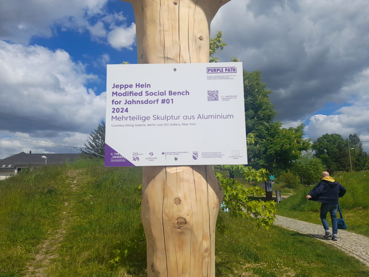 Unseren letzten Halt machten wir ebenfalls in der Gemeinde Jahnsdorf. Hier befindet sich das Kunstwerk „Modified Social Bench for Jahnsdorf“ des international renommierten dänischen Künstlers Jeppe Hein. Inspiriert von den Bänken im New Yorker Central Park und aus seiner Auseinandersetzung mit Themen wie „Nähe und Distanz“ entwickelte der Künstler eine ganze Serie von Skulpturen mit dem Titel „Modified Social Bench“, sie stehen unter anderem in Berlin, New York, Kopenhagen oder Singapur. Eine solche Bank steht nun auch im kleinen Jahnsdorf. Sie ist so gestaltet, dass ihre Nutzung zu einem sowohl körperlichen als auch nonverbal kommunikativen Akt wird. Wir sind eingeladen, Platz zu nehmen. Heins speziell für den Standort Jahnsdorf konzipiertes Bankobjekt bildet durch Rundungen und Höhenunterschiede einen Parcours, der zum dynamischen Sitzen, Liegen oder auch Rutschen einlädt. Auf spielerische Weise löst er so auch das gängige Prinzip des Verbots der direkten Berührung oder Benutzung von Kunst auf und stellt Fragen nach den Konventionen im Umgang mit dem Kunstwerk. Auch diese Bank ist Teil des „Purple Path“.