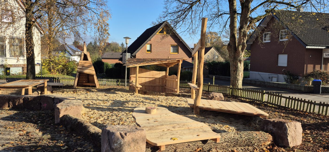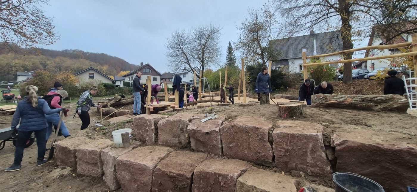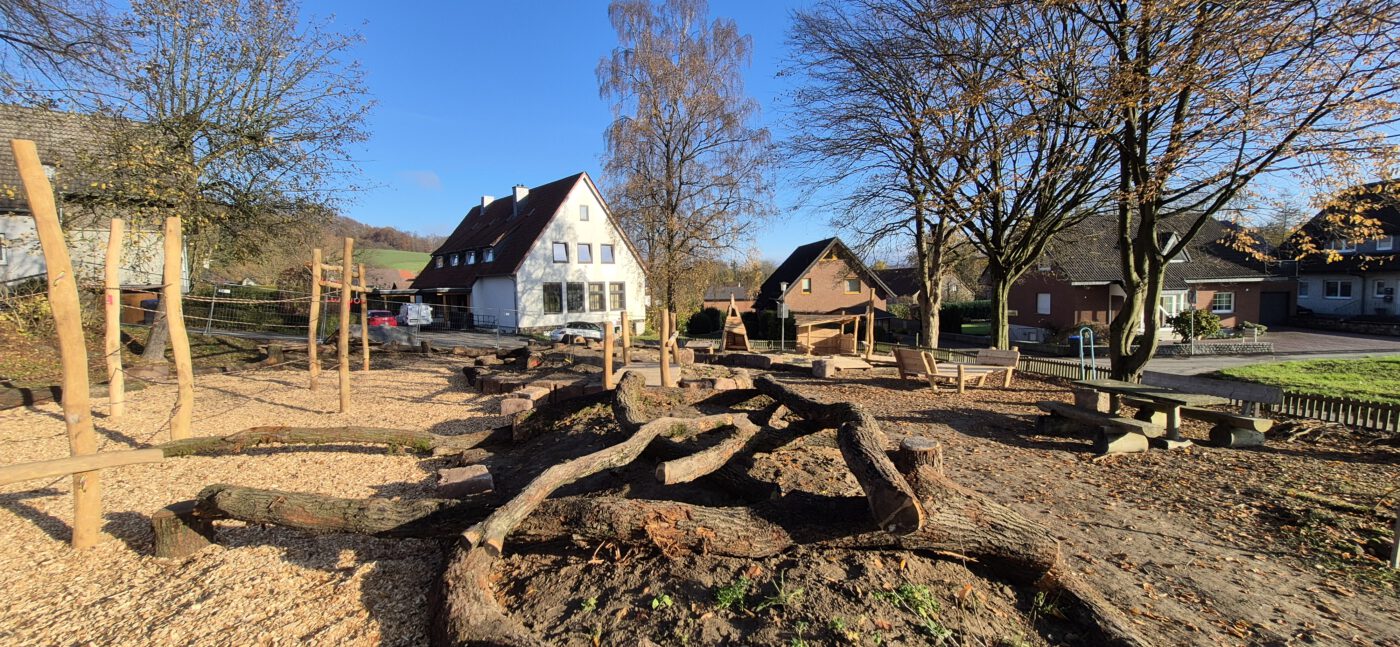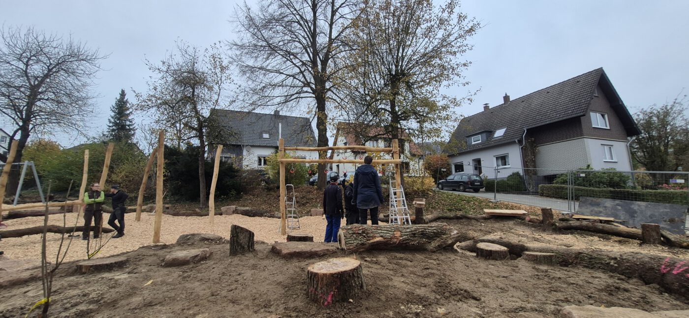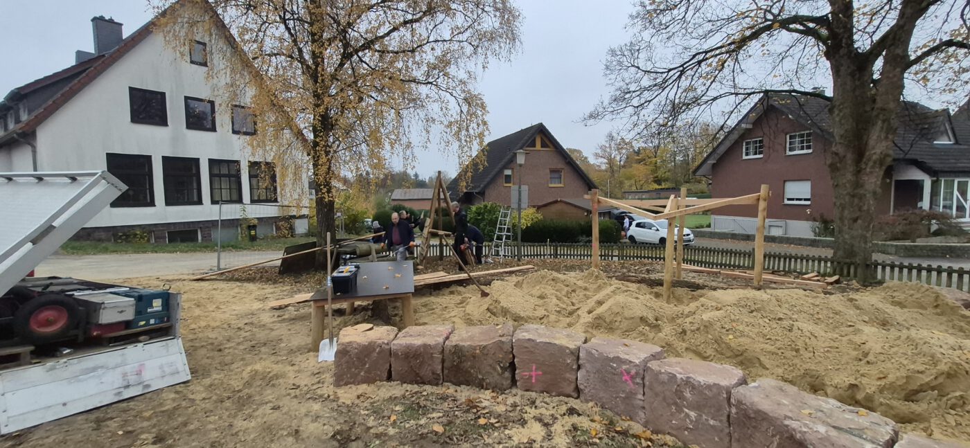 Damit noch vor dem Winter möglichst alles umgesetzt werden konnte, trafen sich viele Westorfer am zweiten Novemberwochenende zu einem „Mit-Mach-Baueinsatz“, um gemeinsam mit der Gemeinde Kalletal als Projektträger einen Großteil der Spielgeräte aufzubauen. Die meisten Spielgeräte sind aus Naturmaterialien, was den Kindern ein naturnahes Spielen und Erleben näherbringt.